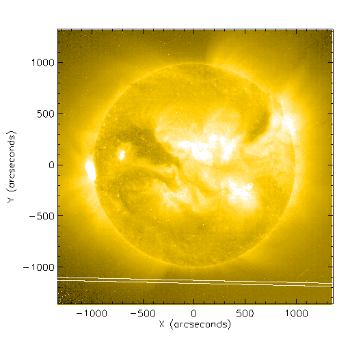 L'image ci-dessous représente la trajectoire prévue de Vénus dans le champ de vue de EIT, un des instruments de la sonde spatiale SOHO. L'image de fond a été obtenue par EIT à la longueur d'onde de 28.4 nm (ultra-violet extrême). La lumière observée à cette longueur d'onde est émise par des ions du fer 14 fois ionisé (des atomes de fer ayant perdu 14 électrons). On observe donc un plasma très chaud (de l'ordre de 2 millions de degrés). Cette image montre que Vénus passera un peu à côté du Soleil, mais sera vue en projection sur la brillante couronne du Soleil.